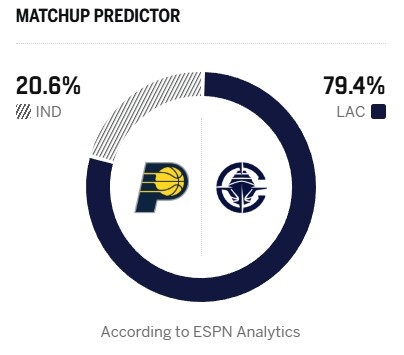 体育资讯-即将追上勇士?ESPN明日胜率预测:快船高达79.4% 步行者20.6%